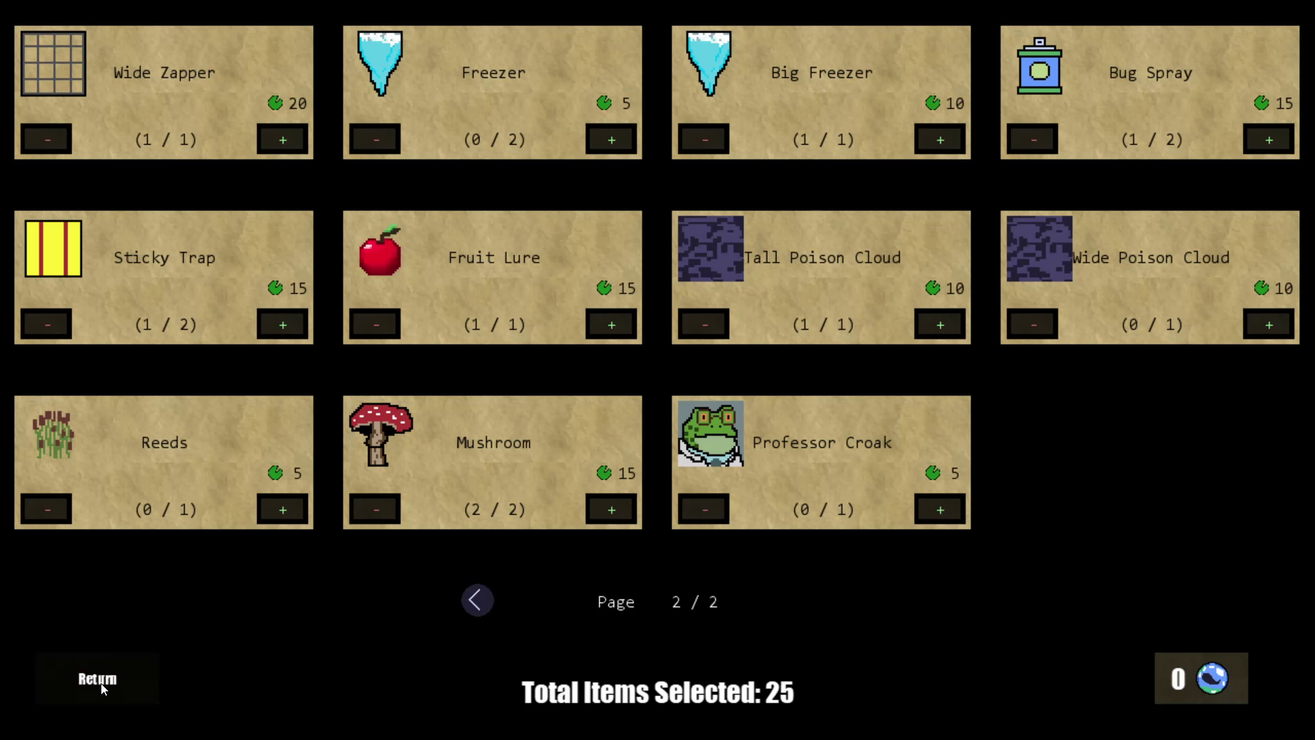 - Placeable Items: Items such as Mushrooms affect frogs in the 4 adjacent tiles. You can stack different items on one frog, but identical items won't double-boost.